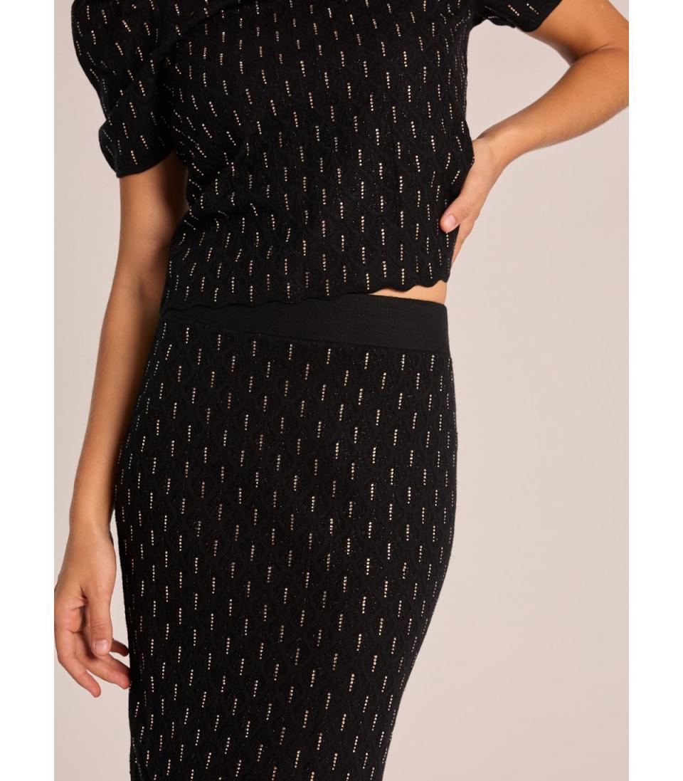 Falda midi de punto de mujer. Corta con detalle de pedrería. Sin cierre con abertura trasera. Medidas de la modelo: altura 1,69cm, pecho 82cm, cintura 60cm y cadera 88cm.