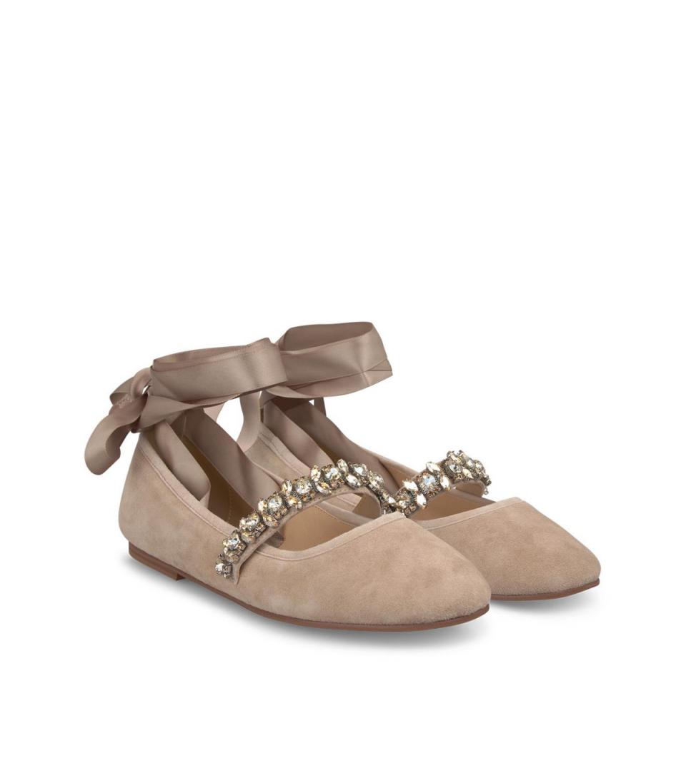 Bailarina plana de mujer con tira de pedrería, puntera redondeada y lazo atado al tobillo. Confeccionada en piel y la altura de tacón es de 1cm.